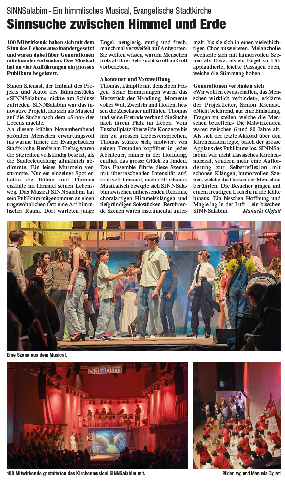 Was für ein Projekt! Während über zwei Jahren wurde das Musicalprojekt „SINNSalabim“ von insgesamt über 100 freiwillig engagierten Mitarbeitenden auf die Beine gestellt und schlussendlich vor rund 1500 Personen in der Evangelischen Stadtkirche Frauenfeld aufgeführt. Wir vom Kernteam möchten allen Zuschauern, Mitarbeitenden, und weiteren Personen, die unser Musical in irgend einer Form unterstützt haben, von herzen DANKE sagen! Ohne euch wäre dieses Musical nicht zu Stande gekommen!